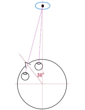 - 画面から顔を30cmほど離して、真ん中の黒い点に焦点を合わせジッと見る。焦点が合わない場合は、合うところまで後退する。黒い点に視線を固定したまま、首を右(または左)に30°向ける。